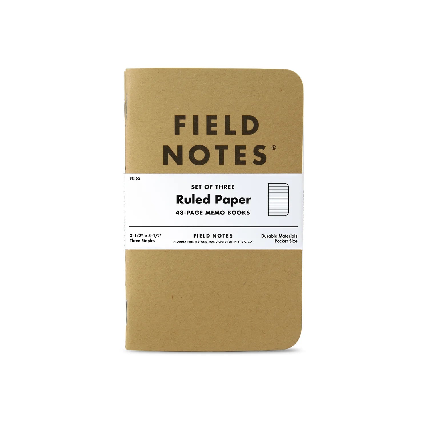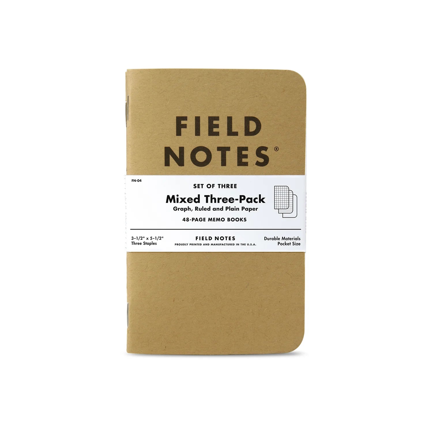 Field Notes' original 48-page notebooks are available in three variations – graph, ruled, or plain paper – or as a mixed 3-pack that includes one of each paper type. Each Original Kraft memo book measures 3-1/2" wide by 5-1/2" tall and is bound by a rugged three-staple saddle-stitch process.