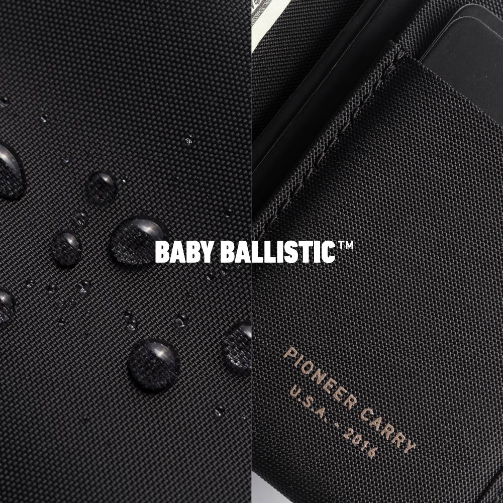 - Baby Ballistic™ - We shrunk down a well-known workhorse fabric and put it through finishing school. Maintaining the rugged/tactical spirit of ballistic nylon, we reduced the bulk, shine, and oversized weave, creating a refined and precise material better suited for your pocket and our fine-tuned construction.