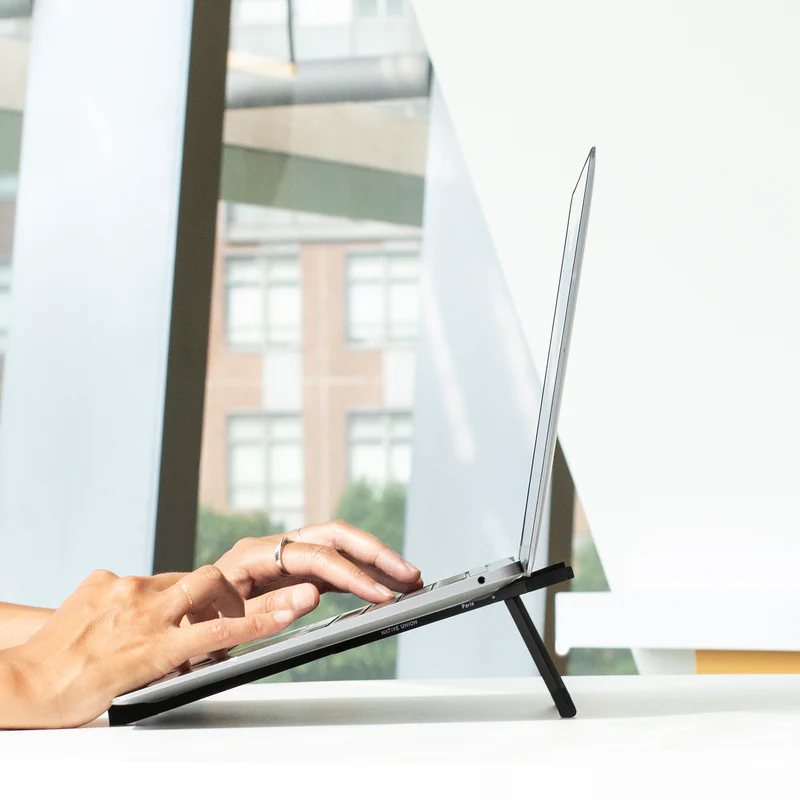 Compact, foldable, portable. Elevate remote working wherever your day takes you with an easy-carry laptop stand. This sleek linear structure props up your laptop or tablet at a comfortable tilt to enhance posture and productivity and ensure constant airflow to your device.