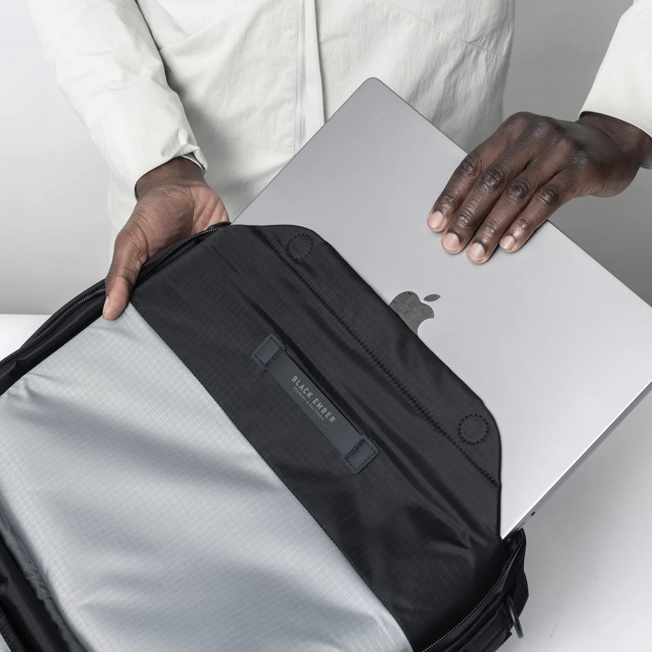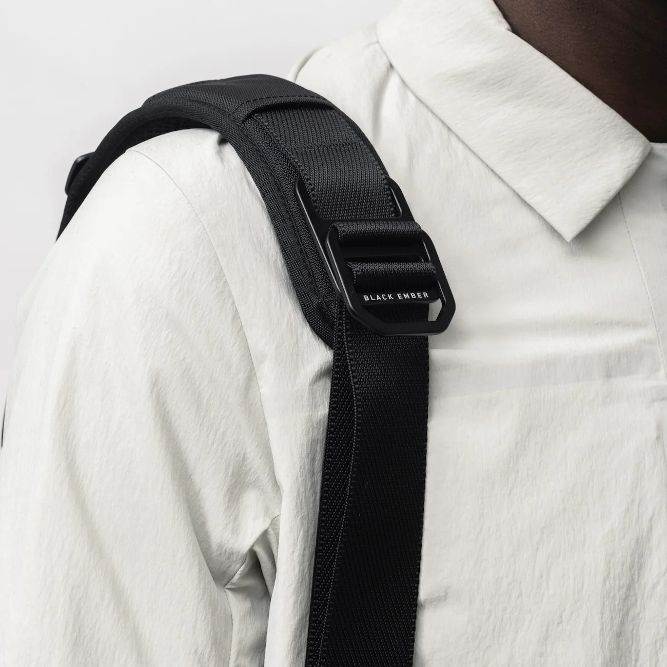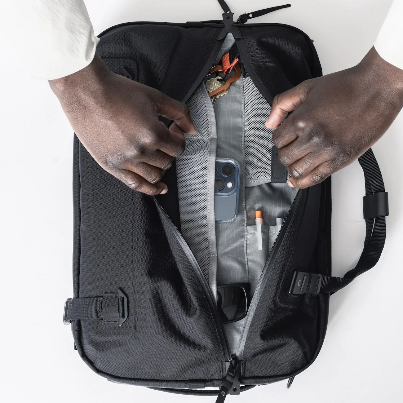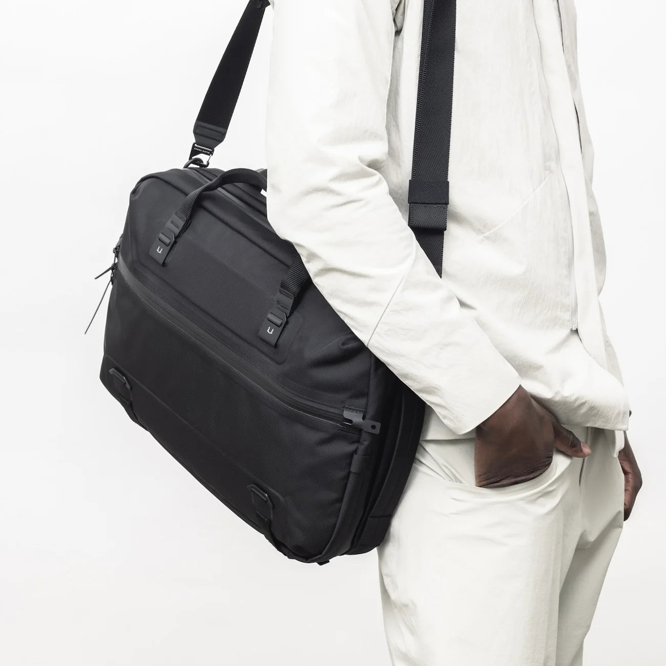The FORGE SB is a sleek 20L soft-brief designed for minimalism and functionality. Crafted from weatherproof CORDURA® re/cor™ RN66—a 100% recycled, ultra-durable nylon—it offers thoughtful organization with a fast-access panel, a padded tablet sleeve, and a suspended magnetic laptop sleeve for up to 16” devices. Featuring quick-release T6 Aluminum Lever™ hardware, an adjustable shoulder strap, and luggage compatibility, the FORGE SB combines innovative materials, precision construction, and a stealthy, blacked-out aesthetic for modern professionals.