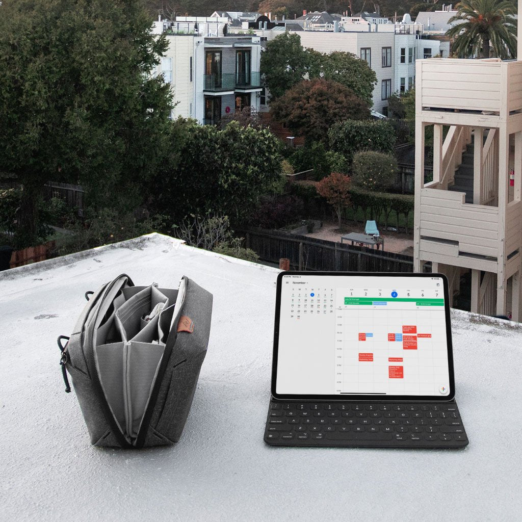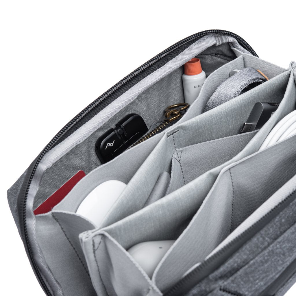 Whether storing cables, everyday gear, or travel essentials, Tech Pouch offers unrivaled organization and ease of access. Origami-style pockets create enormous spatial efficiency, letting you pack more into a smaller space while keeping your items neatly organized and easy to find. Elastic accessory loops keep items like pens, knives, SD cards, and batteries always within reach. Exterior handles and a clamshell-style opening make this pouch a delight to hold and access. The external zip pocket has a cable pass-through for easy device charging. The 200D recycled nylon canvas shell is weatherproof and aesthetically clean.
