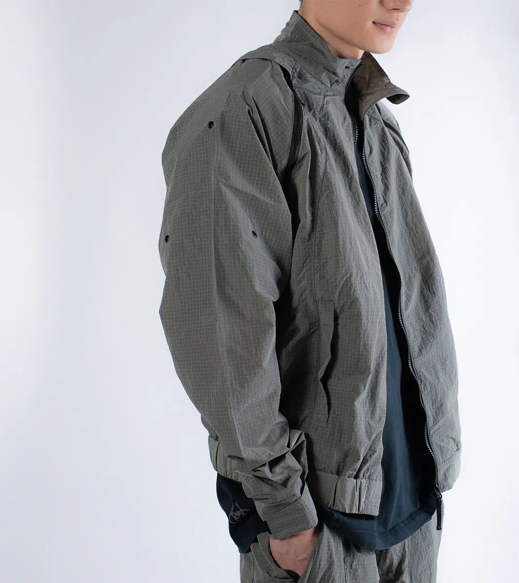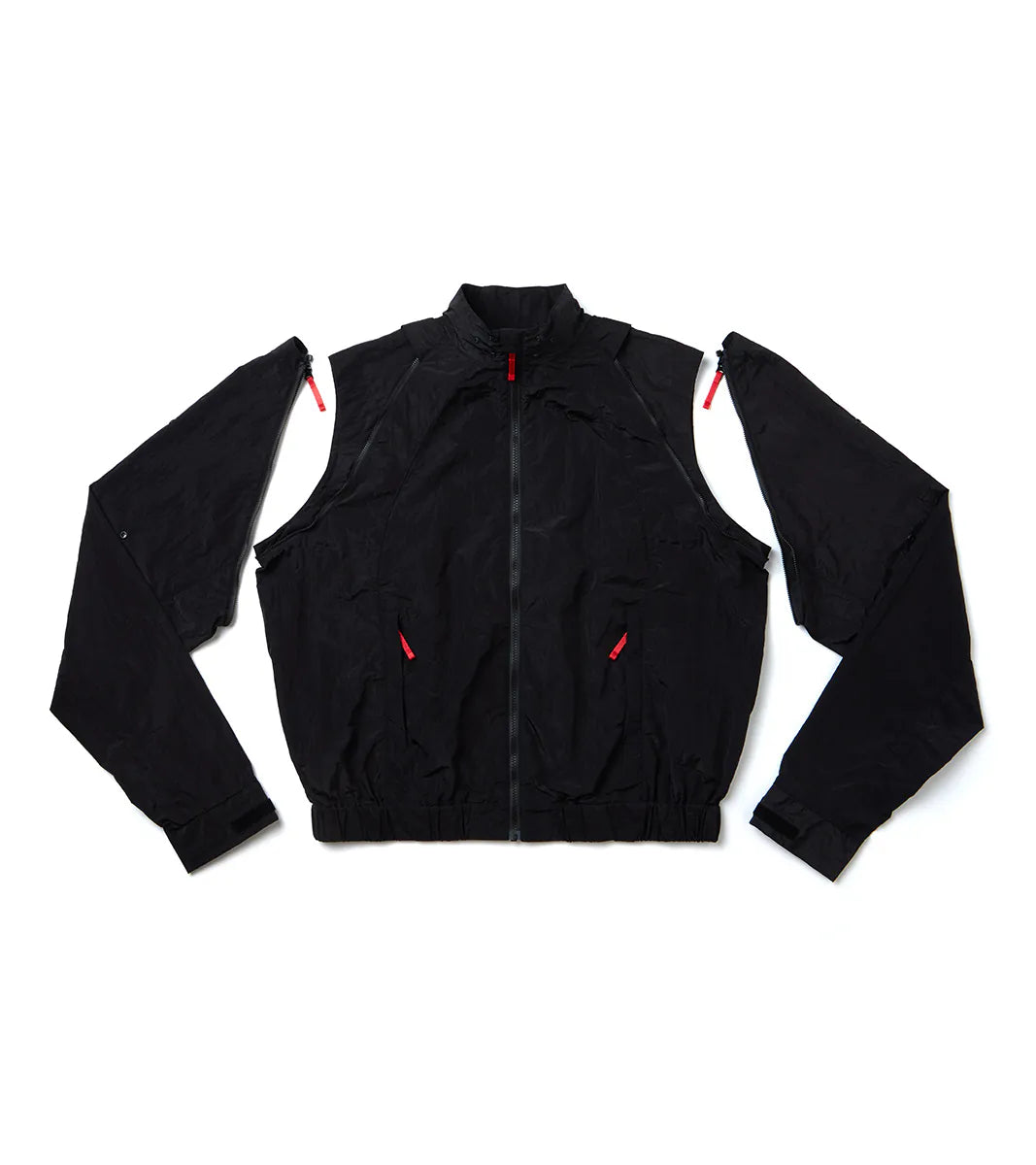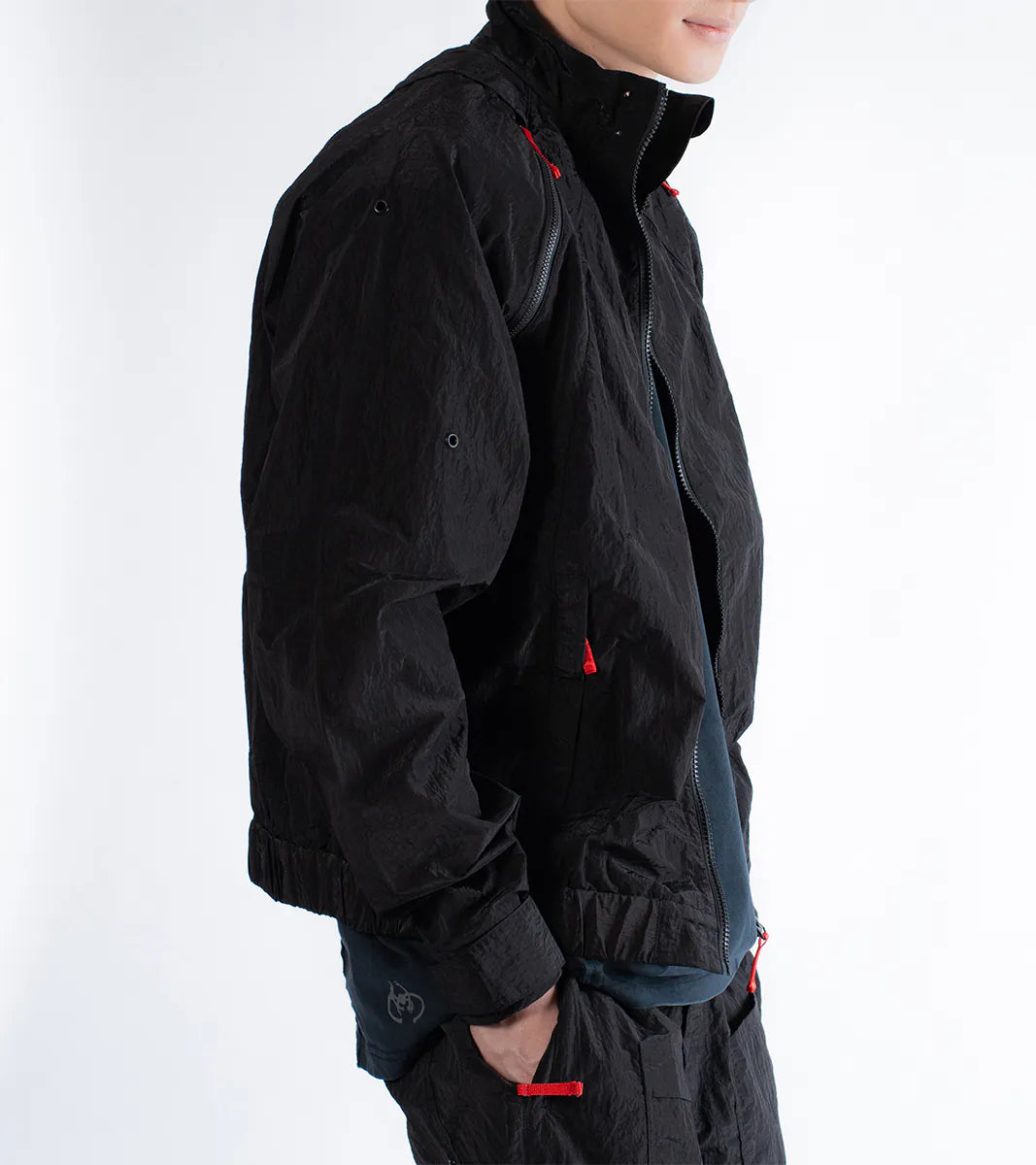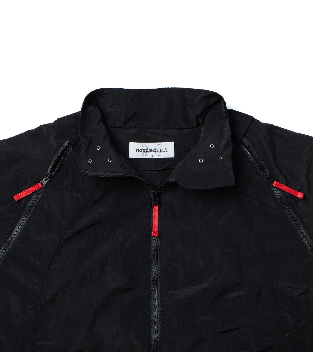 The Detach Shell Jacket by Nozzle Quiz features a sharp and fast silhouette with removable sleeves. Made with rugged zippers, curved lines, breathable vents and tear-resistant grid fabric, the Detach Shell Jacket offers both style and functionality for any season.