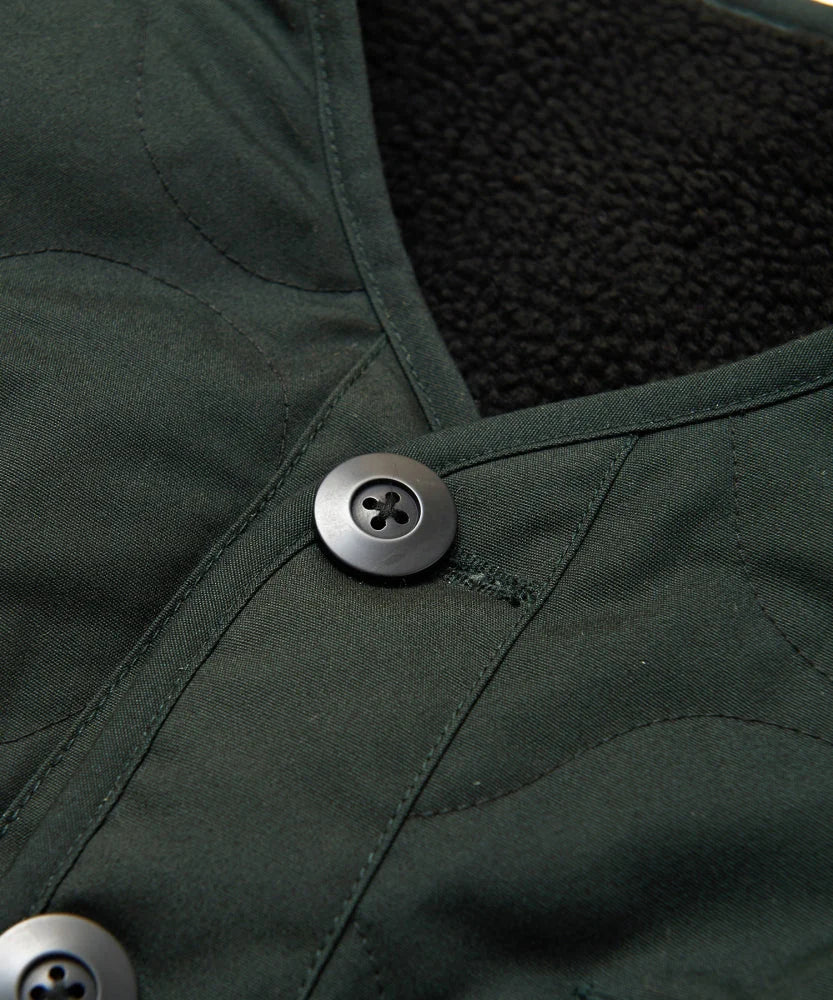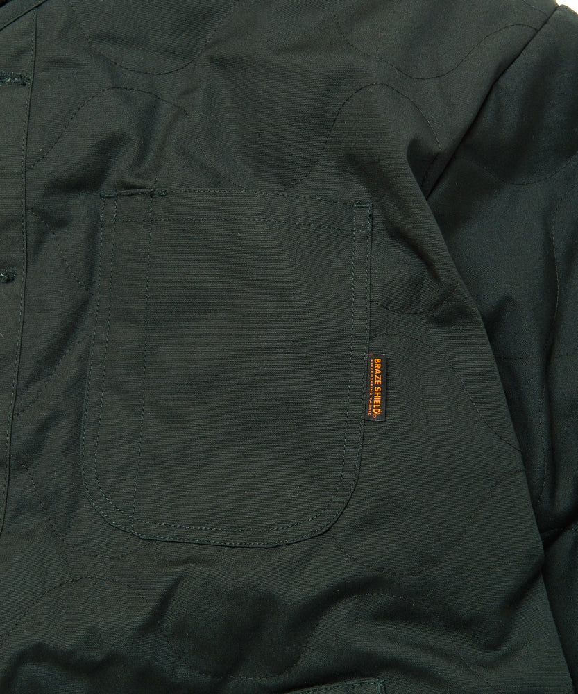 • Outer Side: Made from flame-retardant and water-repellent BRAZE SHIELD fabric with a military-style quilted design.