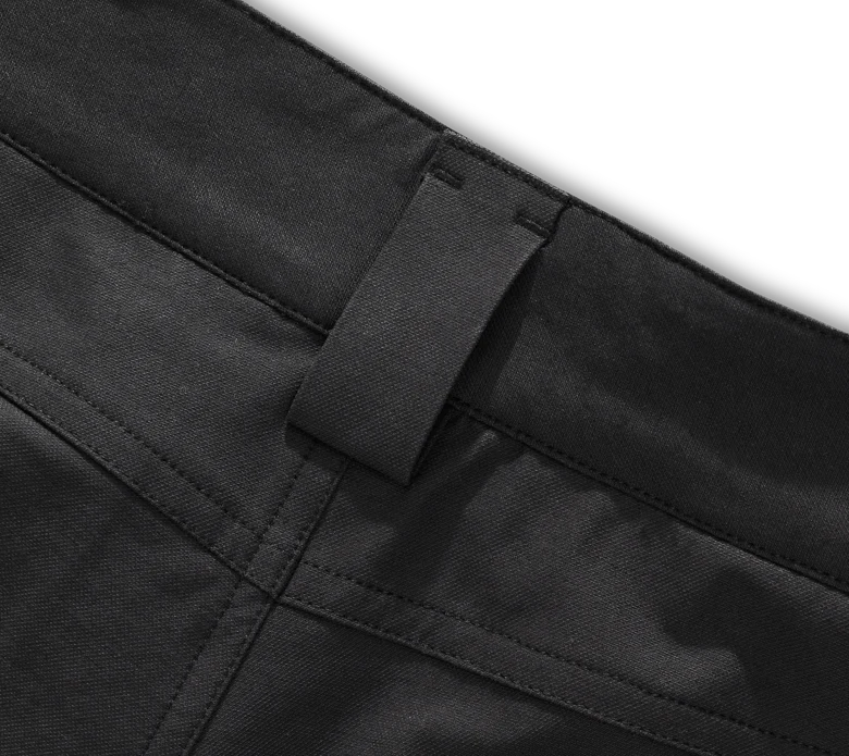 • Lay-flat waistband with side adjuster tabs and snap closure with zip fly