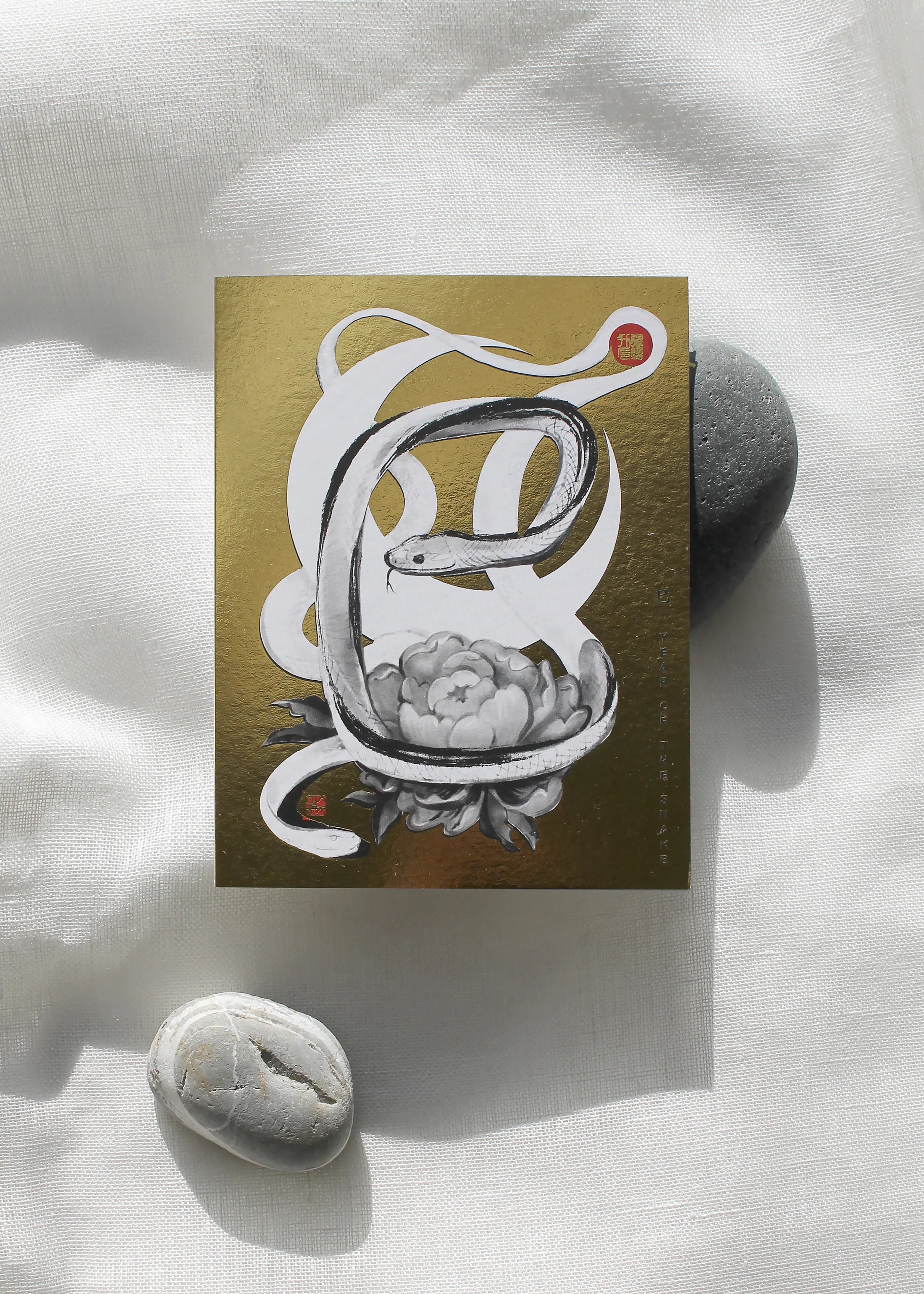 This special greeting card by Rice & Ink features a beautiful Sumi-E style snake against a striking gold background. The perfect greeting card for life's special events such as birthdays, New Years greetings and more!