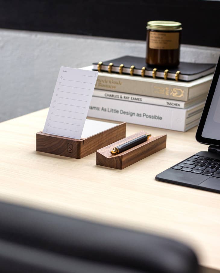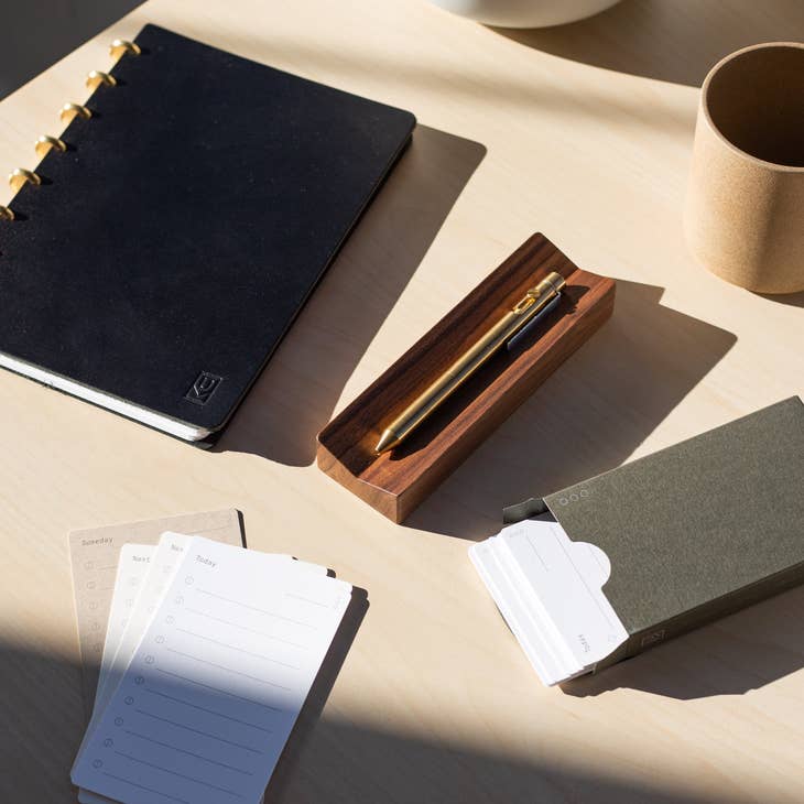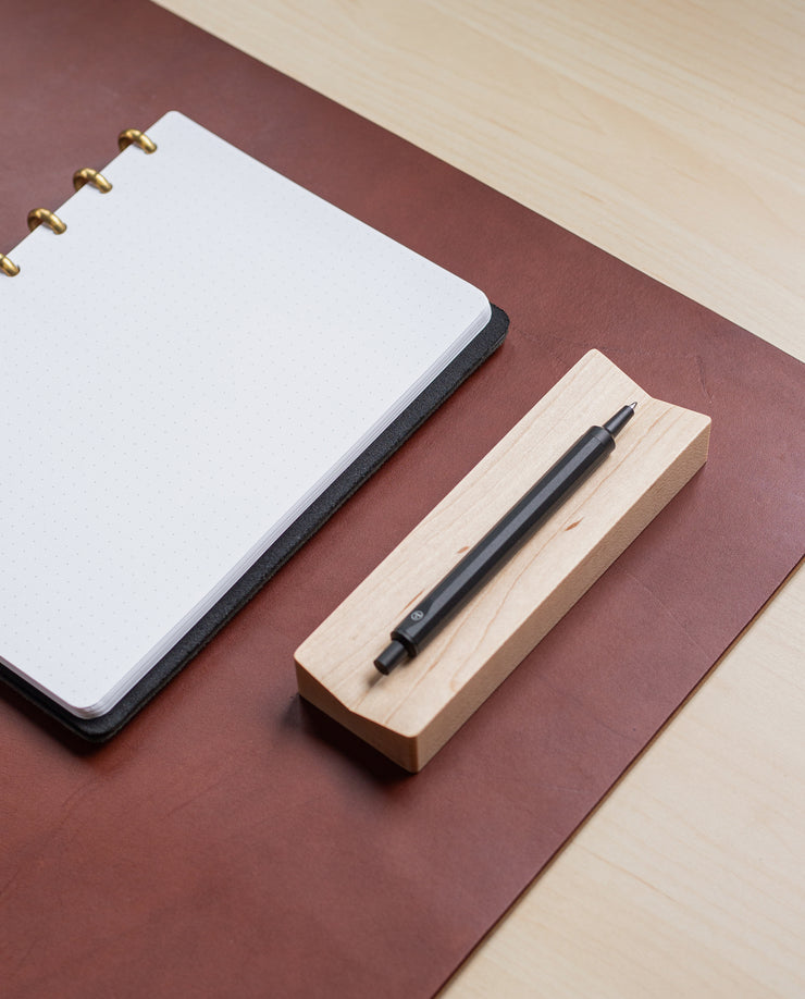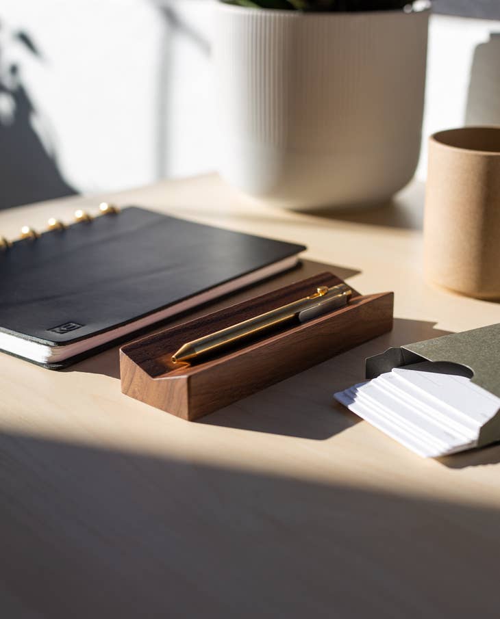 Analog の現地製造プロセスは、ソリッド ウォルナット ペン トレイに見られるように、予想外の創造性を生み出しました。Analog のカード ホルダーから余ったウォルナットの切れ端から作られた各トレイは、ソリッド ウォルナットから削り出され、完璧に研磨され、透明なマット仕上げで密封されています。このペン トレイは、お気に入りのペンを手の届くところに置いておくことができ、Analog および HMM ボールペンと完璧にマッチします。