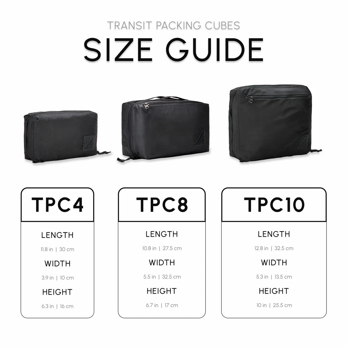 • Sized for maximum packing options within all of our bags.