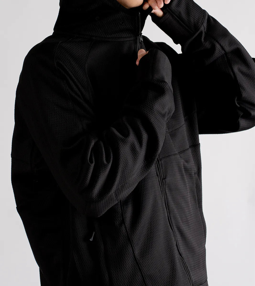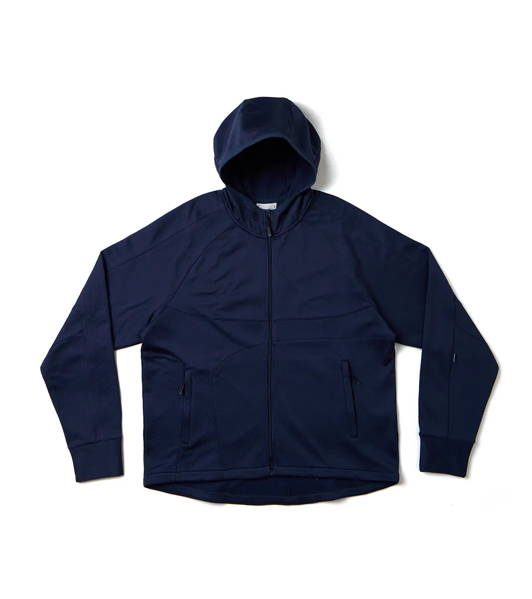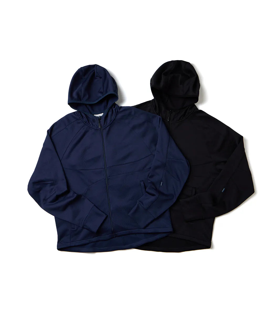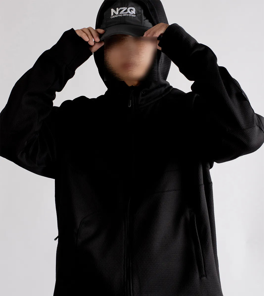 The Arc Fleece Hoody by Nozzle Quiz is a must-have mid-layer jacket for deep autumn and early winter, perfect for use throughout the entire season. The fabric is made of advanced brushed fleece, with a tightly arranged birdseye pattern on the surface and a brushed interior. The brushed side creates a "Dead Air" space within the fabric, which prevents heat convection and effectively retains body warmth. The hoody also features Nozzle Quiz's signature "Arc Curve" design language, with breathable eyelets and unique embroidered details.