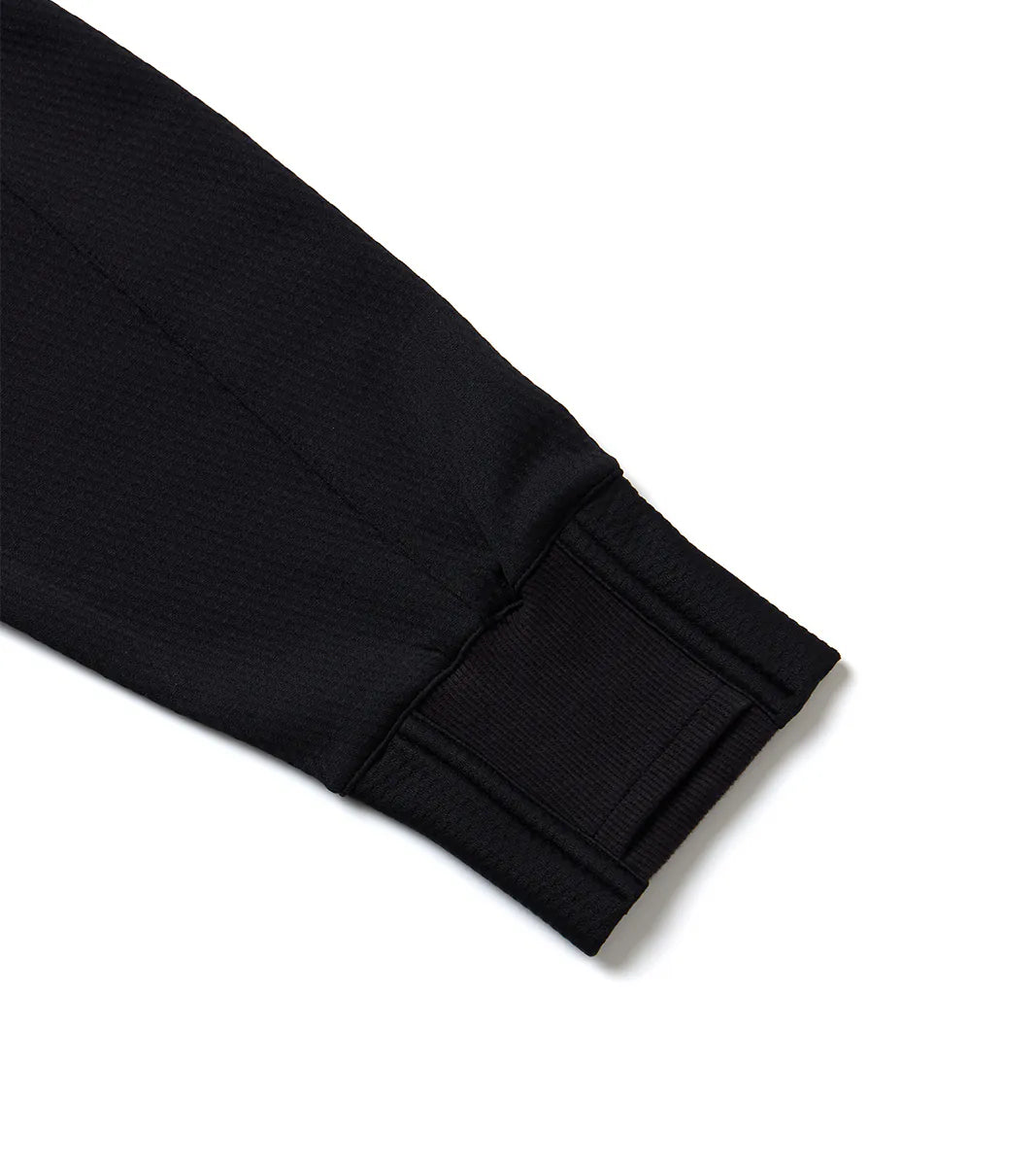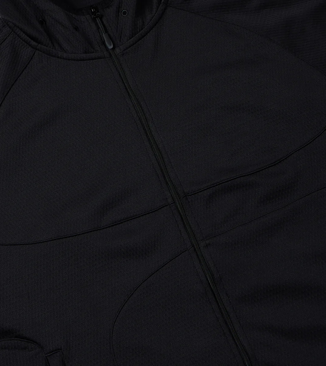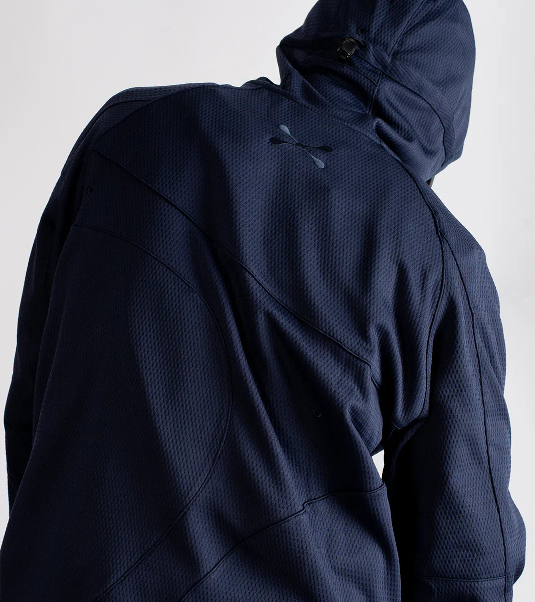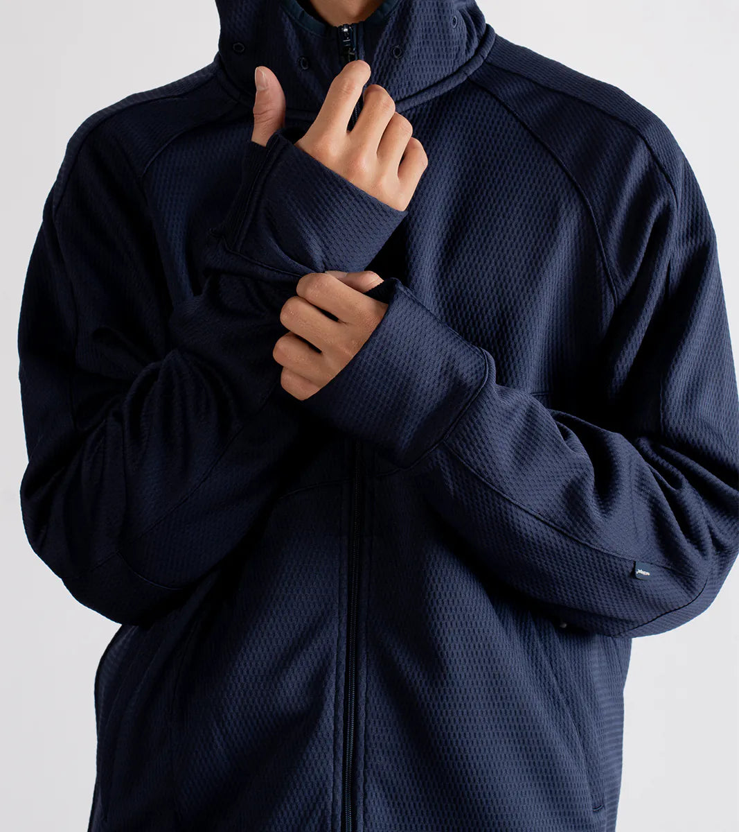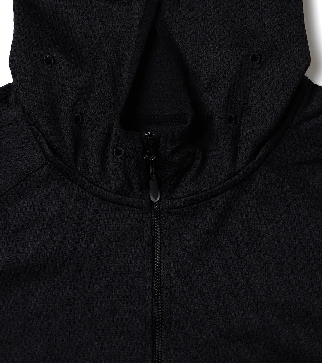 The Arc Fleece Hoody by Nozzle Quiz is a must-have mid-layer jacket for deep autumn and early winter, perfect for use throughout the entire season. The fabric is made of advanced brushed fleece, with a tightly arranged birdseye pattern on the surface and a brushed interior. The brushed side creates a "Dead Air" space within the fabric, which prevents heat convection and effectively retains body warmth. The hoody also features Nozzle Quiz's signature "Arc Curve" design language, with breathable eyelets and unique embroidered details.