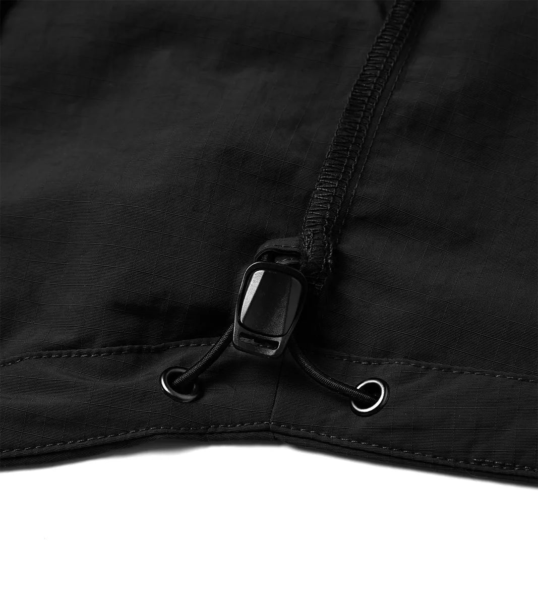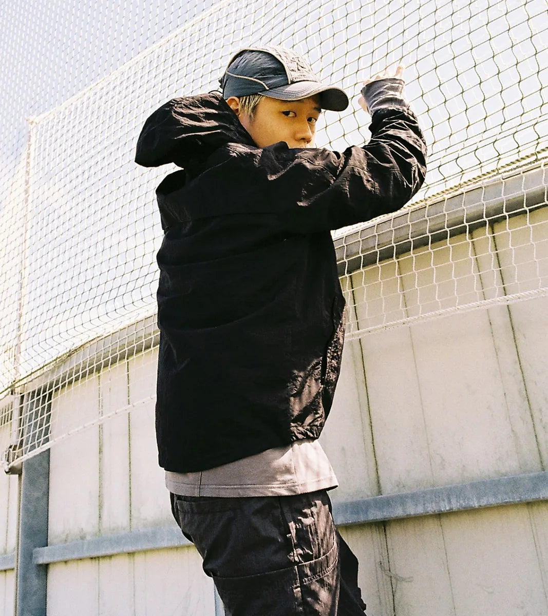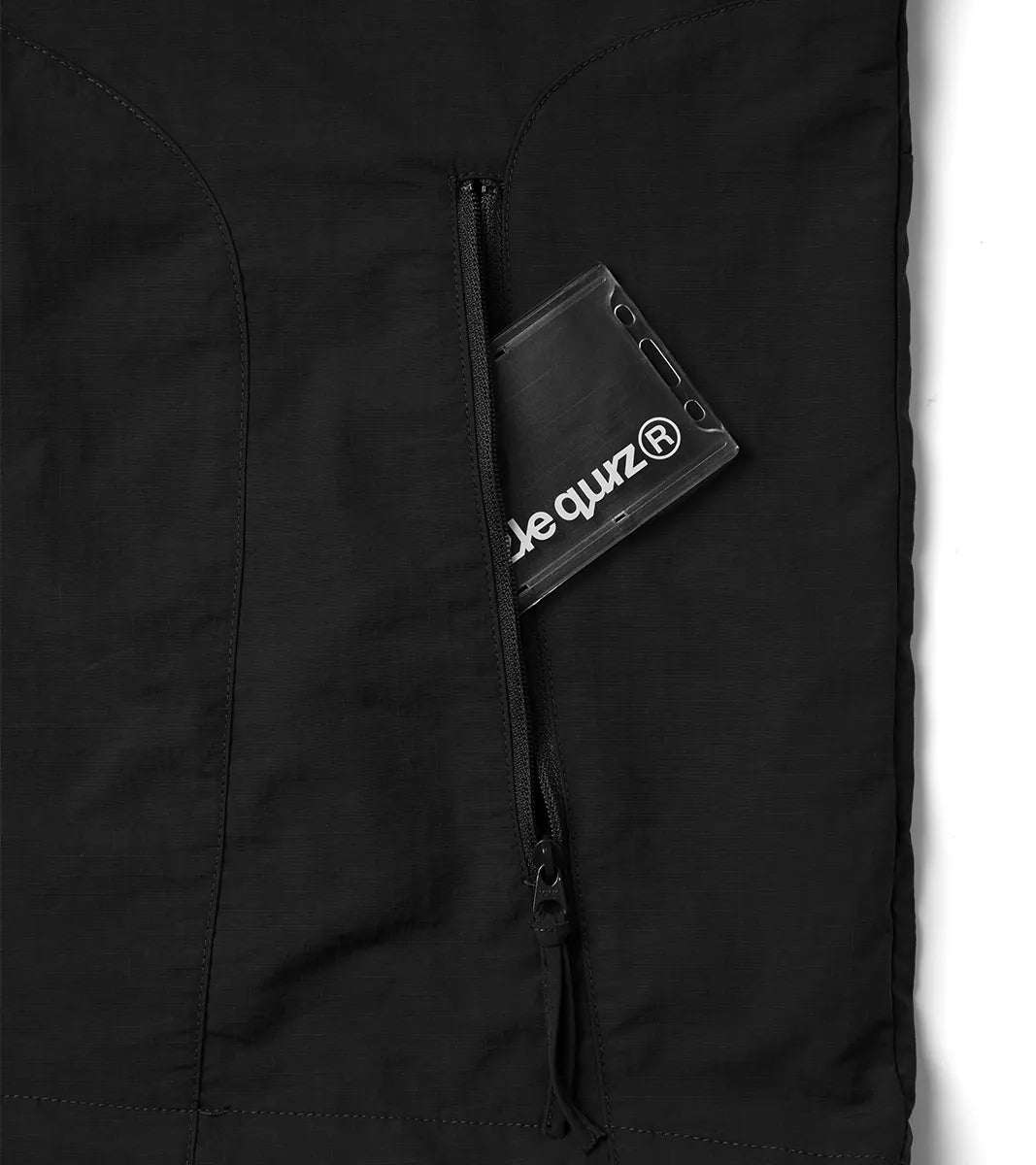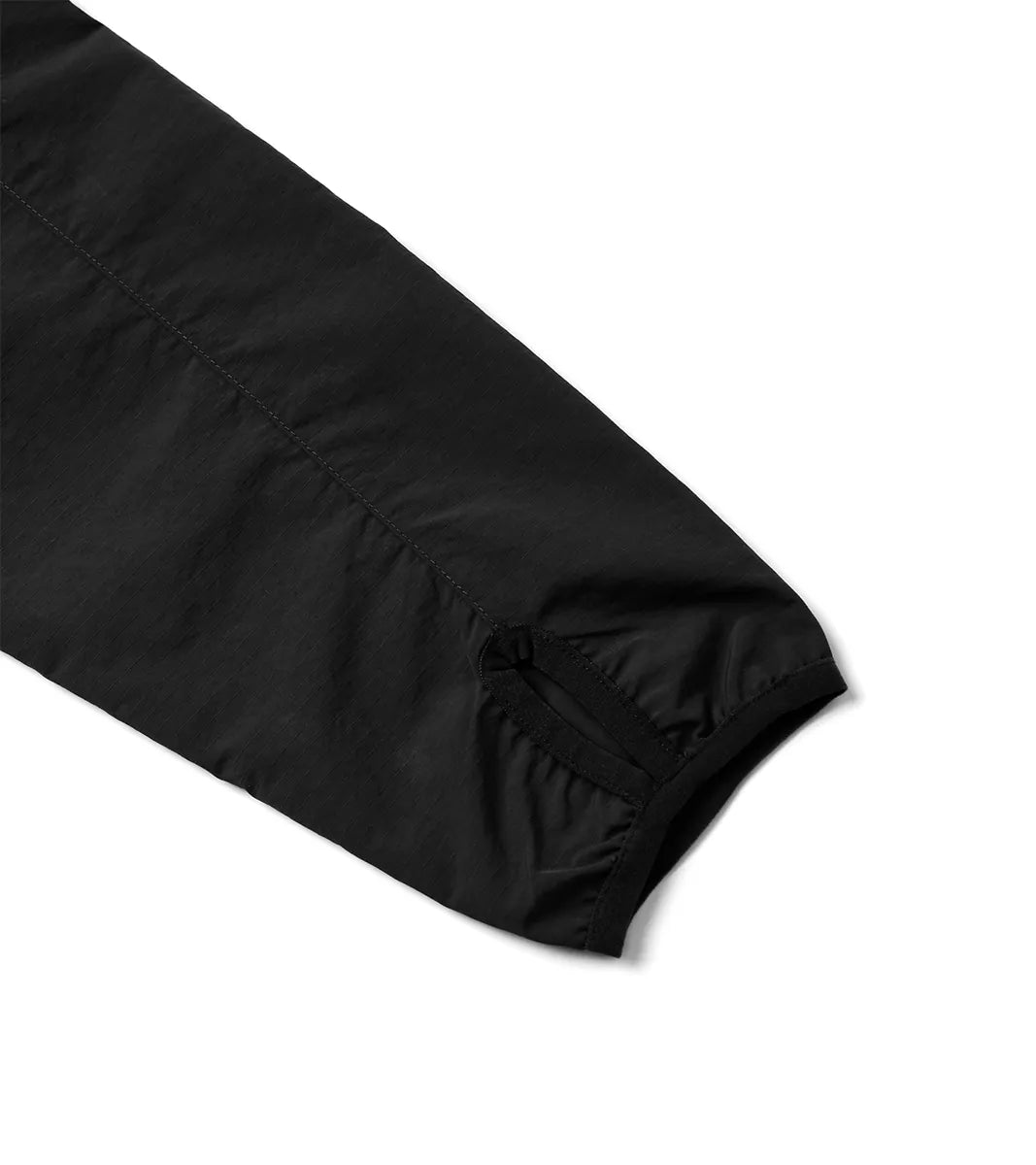 The Arc Windbreaker by Nozzle Quiz is a reimagined version of the typical training windbreaker. Featuring Nozzle Quiz's signature "Arc Curve" design language, the Arc Windbreaker's sweeping curved cut across the body breaks the stiffness often associated with traditional training gear. This style specifically uses 100% nylon ripstop fabric, offering just the right amount of of thickness along with a dry hand feel, making it the ideal lightweight outwear layer for those cooler days ahead.